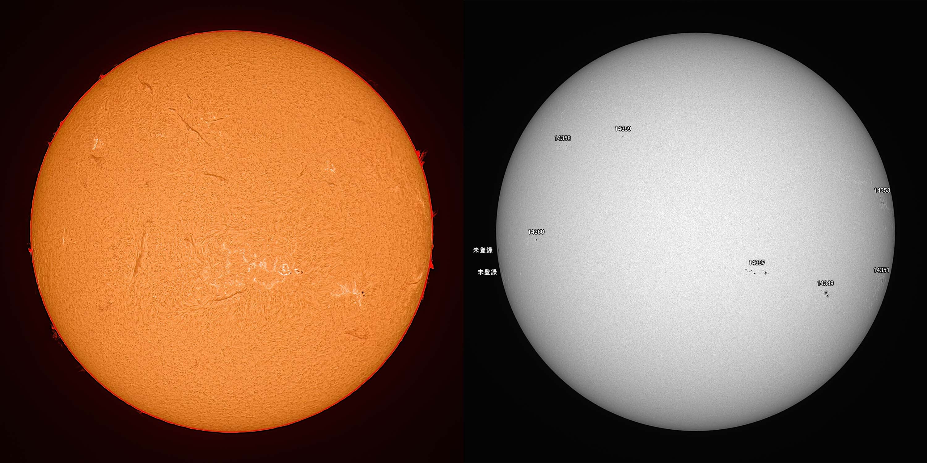 光球面:FireCapture、ROI 3600x2400、Gain 100、1.75msec x1000、撮影時間 31秒/プロミネンス:FireCapture、ROI 3600x2400、Gain 300、1.75msec x1000、撮影時間 31秒