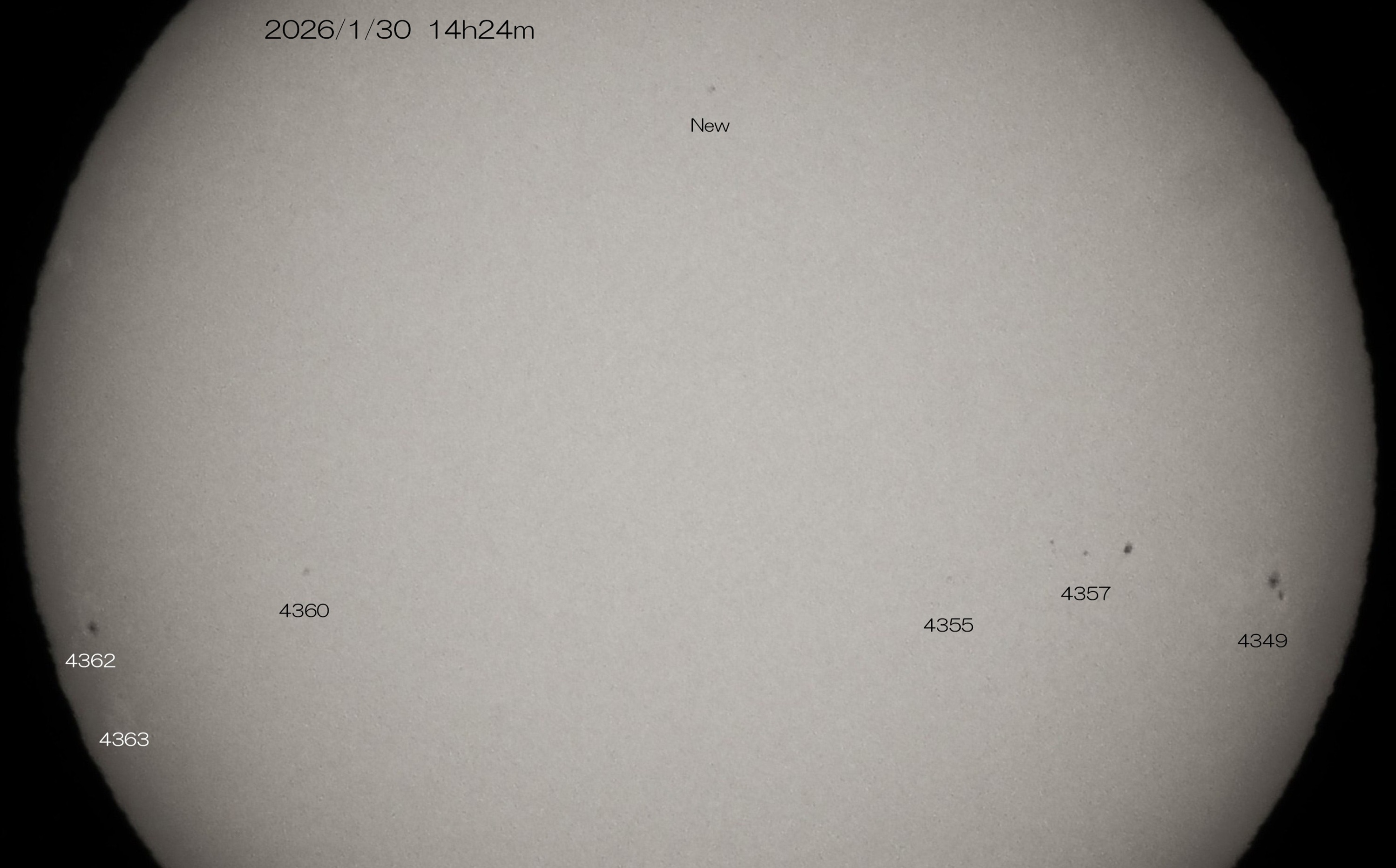 シーイングが悪く、今回も小さな南東端の4363群、北半球高緯度の新黒点群、また西側の4355群の3つが揃って写っていた唯一の画面でした。