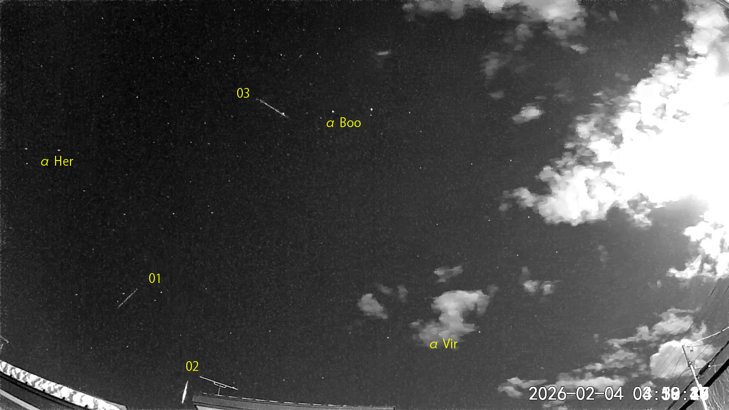 03:50から約1時間の3コマを処理しました。02時台は雲が多いほかは快晴。朝の最低気温はマイナス12℃。 出現した順に数字と記号を始点付近に記入。tは痕traceあり。