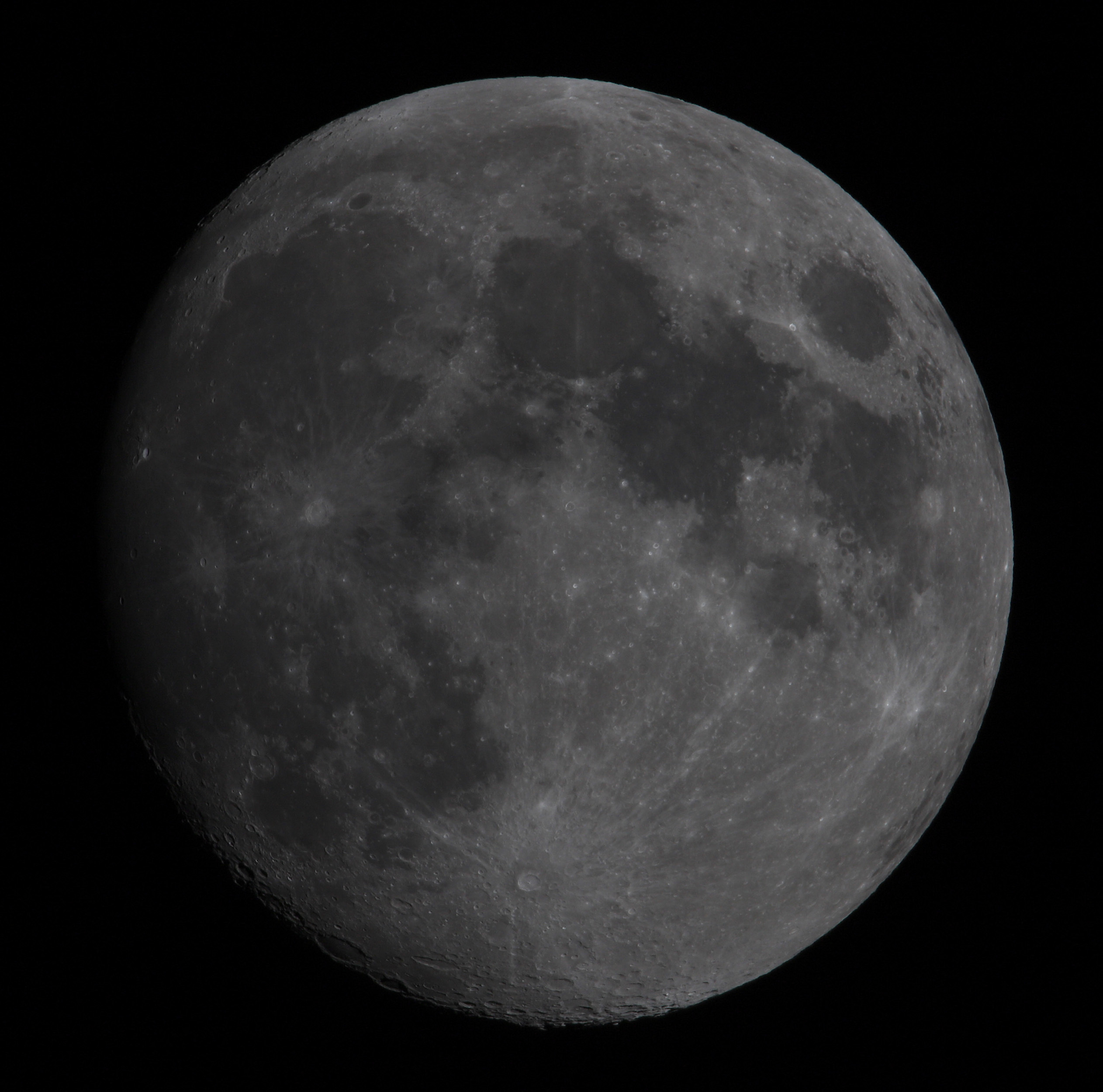 「月齢12.0の月」を撮影しました。  花粉の影響か少し霞んでいましたがシーイングが良かったので撮影を短時間で終える事ができました。  残り時間は久しぶりにアイピースを付けて眼視で観測しました。  各クレーターが明瞭に見えていました。  かなり眩しく見えていたのですが減光用の「ムーングラス」を持ってきておらず、代わりに日中に使う「サングラス」  を掛けて見ていました(怪しい姿です)。