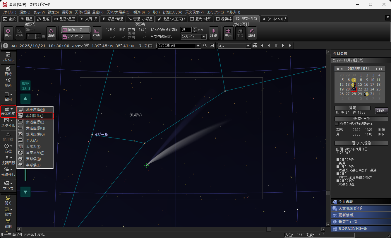 天文シミュレーションソフト「ステラナビゲータ12」でレモン彗星を表示し、位置の確認と構図の検討など撮影計画を立ててみましょう。