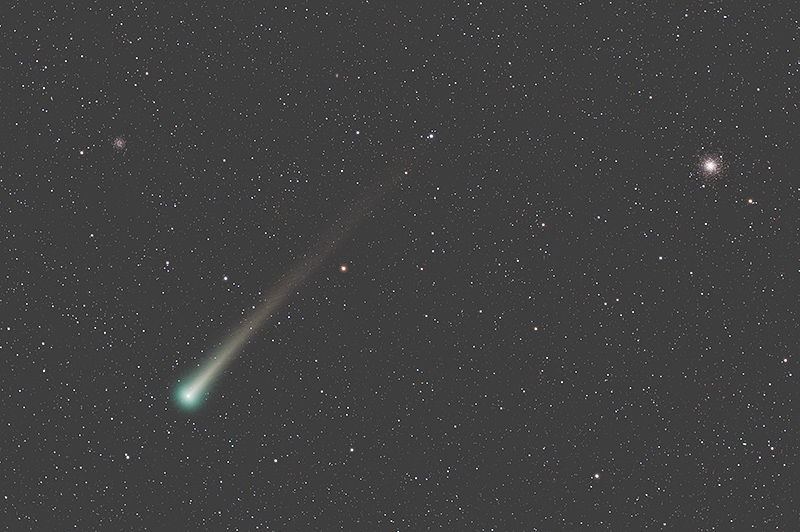 彗星をアップでダイナミックに撮るには、望遠レンズや望遠鏡を使用し、星を自動追尾する赤道儀に搭載して撮影を行います。尾の詳細な構造が写って驚くこともあります。
