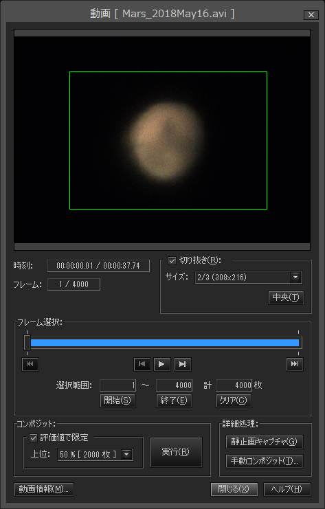 今回の「8.0fアップデータ」では、動画読み込みでMP4、MOV、SERなどの形式に対応し、鮮鋭度の高いフレームを自動選別してキャプチャとコンポジットを連続で実行できるようになりました。動画の一部分に写った惑星を切り抜いてコンポジットすることもできます。