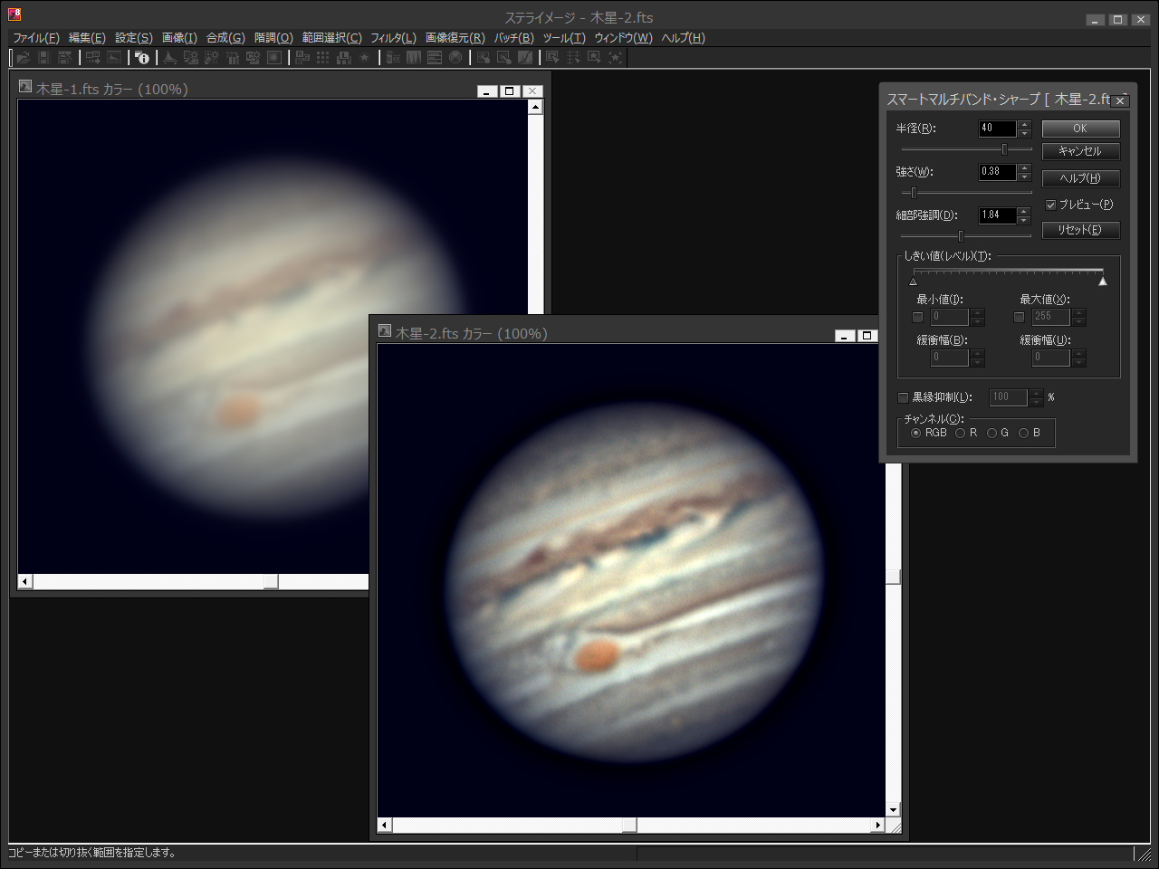 「スマートマルチバンド・シャープ」機能では、複数半径のアンシャープマスクで細部から大きな模様までを一度に強調。「惑星色ずれ補正」では、大気のプリズム効果で発生する色ずれを除去して美しい惑星画像に仕上げられます。