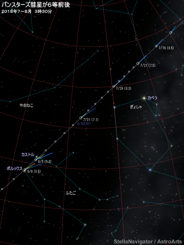 8月上旬ごろ、パンスターズ彗星(C/2017 S3)が6等前後まで明るくなる可能性があると予想されている。2017年9月に発見された彗星で観測数が少ないため、明るさの見積もりには不定性が大きい。