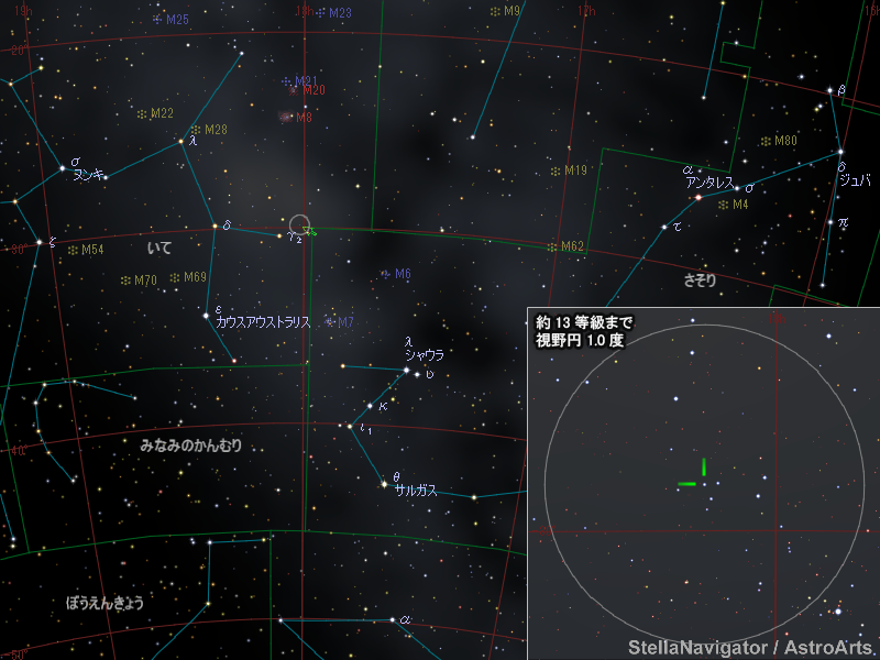 この天体の位置は以下のとおりで、いて座γ星の近くです。