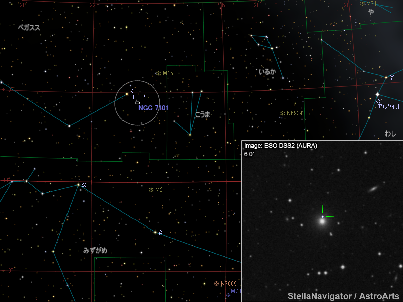 NGC 7101周辺の星図と、DSS画像に表示した超新星。画像クリックで星図拡大(「ステラナビゲータ」で星図作成。DSS画像の版権について)