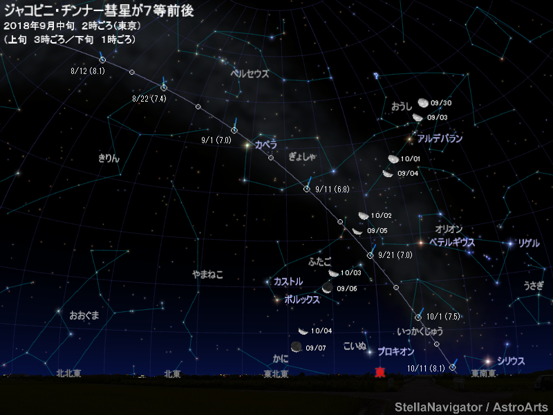8月下旬から9月下旬ごろまで、ジャコビニ・チンナー彗星(21P)が7等前後まで明るくなって見えると予想されている。