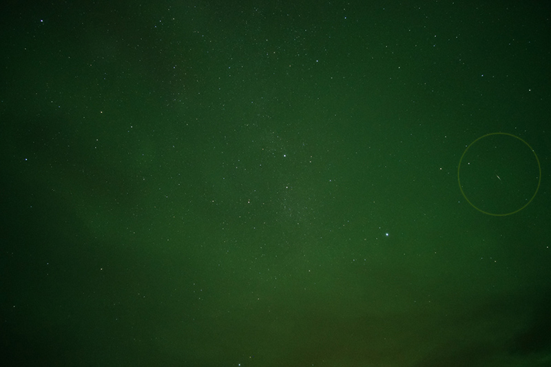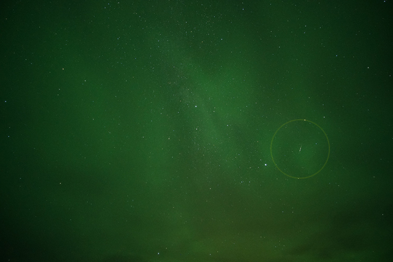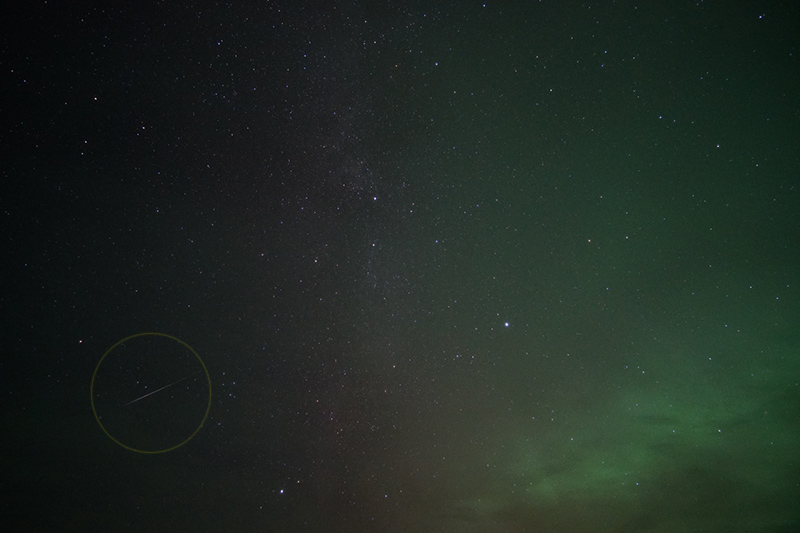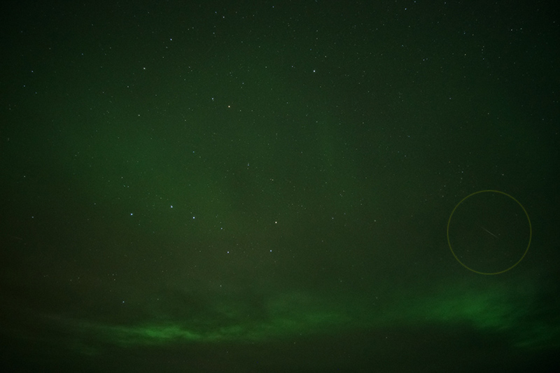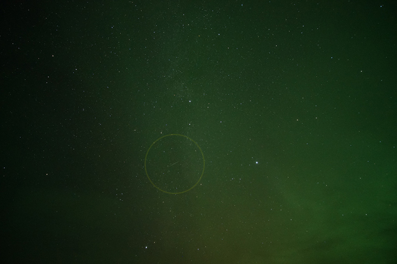 10月りゅう座流星群の流星。オーロラの影響で背景が緑になっている。画像クリックで表示拡大(撮影時刻はファイル名参照)