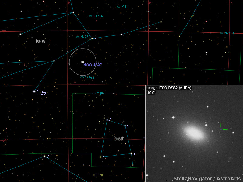 NGC 4697周辺の星図と、DSS画像に表示した超新星。画像クリックで星図拡大(「ステラナビゲータ」で星図作成。DSS画像の版権について)