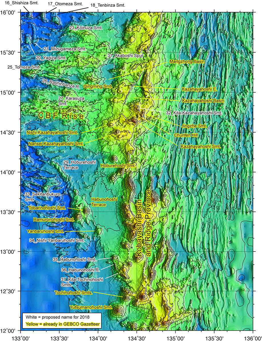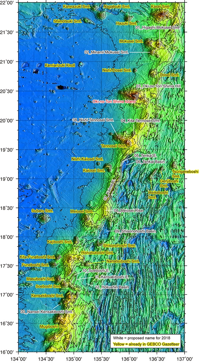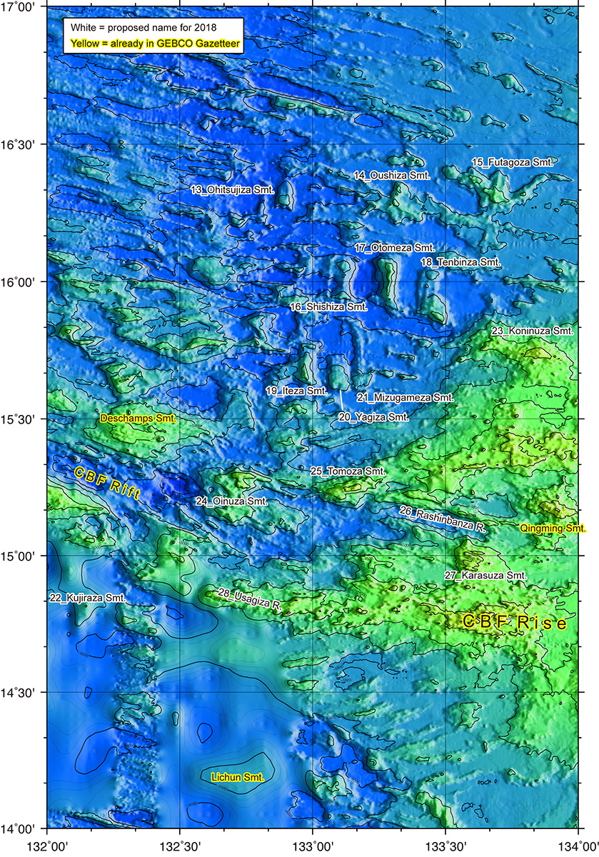 国際的には、国際水路機関(IHO)とユネスコ政府間海洋学委員会(IOC)との共同プロジェクトである大洋水深総図(GEBCO)において、海底地形名称の統一が行われている。各国が提案した海底地形名称は、海底地形名小委員会(SCUFN)によってその妥当性が審議され承認される。このほど、2018年10月にニュージーランドで行われたSCUFNの会議において、日本が提案したものから73件の名称が承認されたことが発表された。