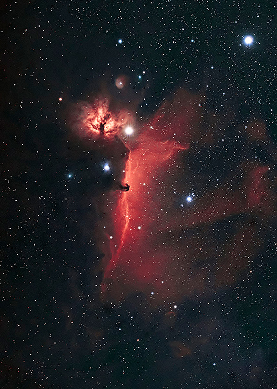 馬頭星雲&燃える木星雲(Barnard 33 & NGC 2024)。撮影:根本泰人 2018年11月15日 Skywatcher Espri100ED Pro Quintuplet(f=500mm F5)+キヤノン EOS 6D(HKIR) ISO6400 30秒露光×121コマ 総露出時間約1時間 CGEM赤道儀+ステラショットでディザリングマルチスターガイド ダーク、フラット、フラットダーク、バイアス適用して画像処理。画像クリックで表示拡大