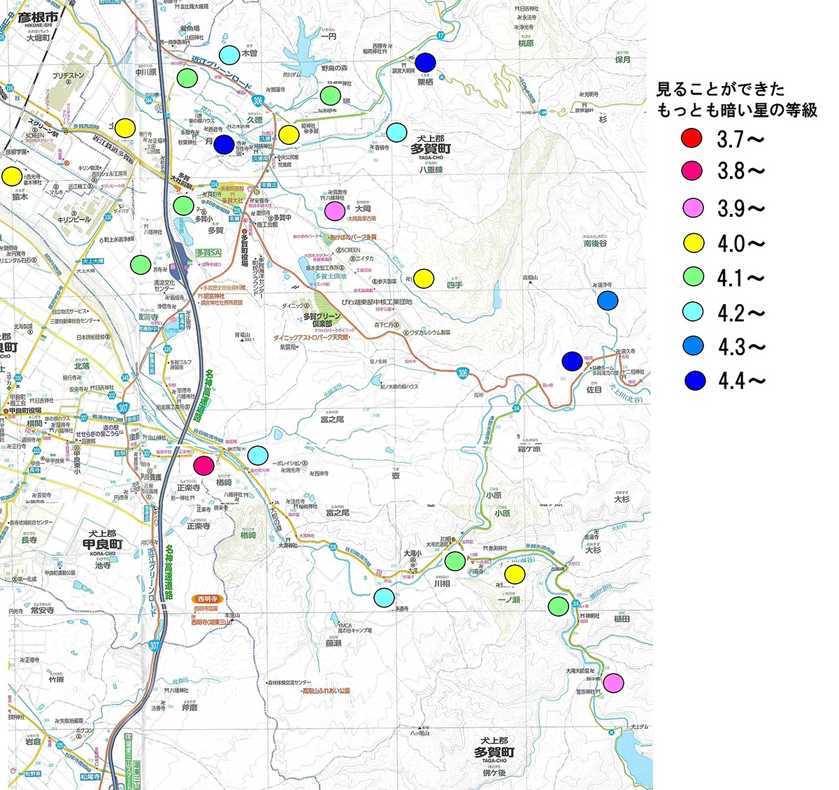 集められたデータから多賀町内の大字ごとの平均限界等級が求められ、これを地図上にプロットすることで、多賀町内においては平野部より山間部のほうがより暗い星まで見える状況が確認できました。