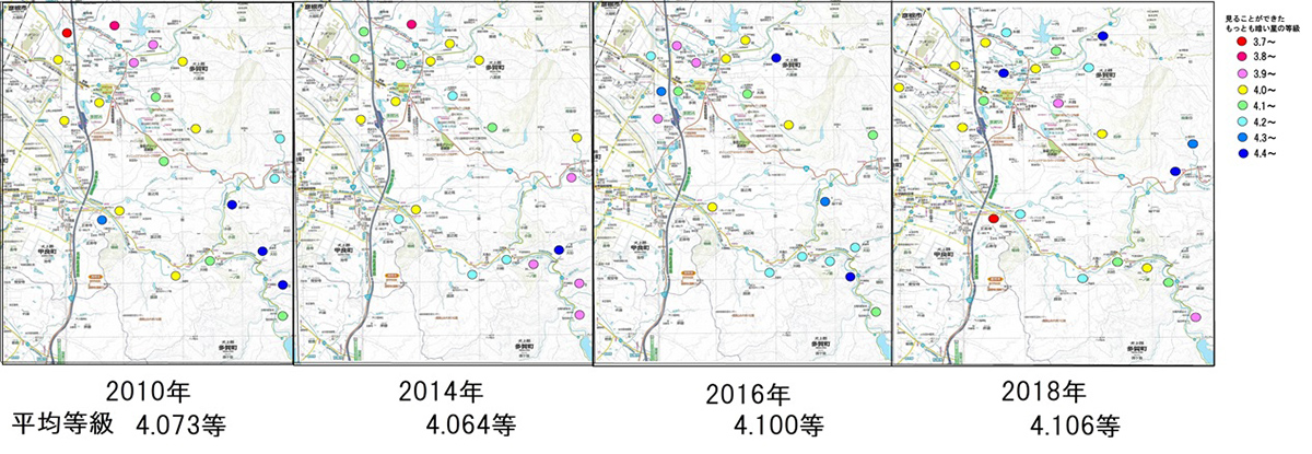 また、これまでに実施された星空調査のうちの2010年・2014年・2016年の調査結果との比較から、以前の調査に比べると平野部と山間部の星の見え方の差が縮まってきていること、すべてのデータを合わせて得られた多賀町全体での平均限界等級は、微妙にではあるがこの8年間でより暗い星まで見えるようになっている可能性が高いことなどが明らかにされました。