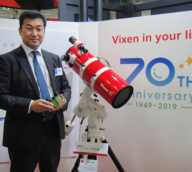 創業70年記念の「ビクセン レッドカラーR200SS鏡筒(参考出品)」と同社の新妻社長。架台はSXP2。新型星空雲台「ポラリエ・U(開発中)」を手にしているのは同社開発部の加島さん。画像クリックで表示拡大