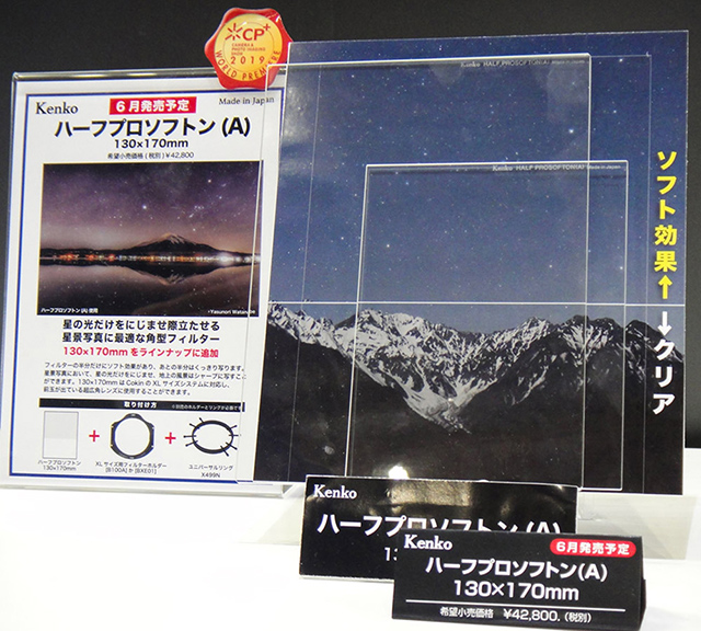 次はケンコー・トキナーのブース。ケンコーと言えばフィルターということで、天体・星景写真ファン注目の2種のフィルターをピックアップしよう。一つめは「ハーフプロソフトン」を横幅130mmにした大判バージョン。地上景色はシャープなまま星空だけを滲ませることができることで星景写真ファンに人気だが、従来の横幅100mmのフィルターでは超広角レンズでホルダーのケラレが発生したり、前玉が大きく凸状に飛び出している明るい超広角ズームレンズなどに対応できなかったが、横幅130mm用フィルターホルダーを介して取り付けられるようになる。もう一つは、水銀灯やナトリウムランプの輝線波長をカットして光害を軽減する星景・夜景撮影用フィルター「スターリーナイト」。近年はLED照明など、光害の元になる光源の種類が増えているので効果は限定的だが、光害による色カブリを低減して星空の色補正が容易になる。