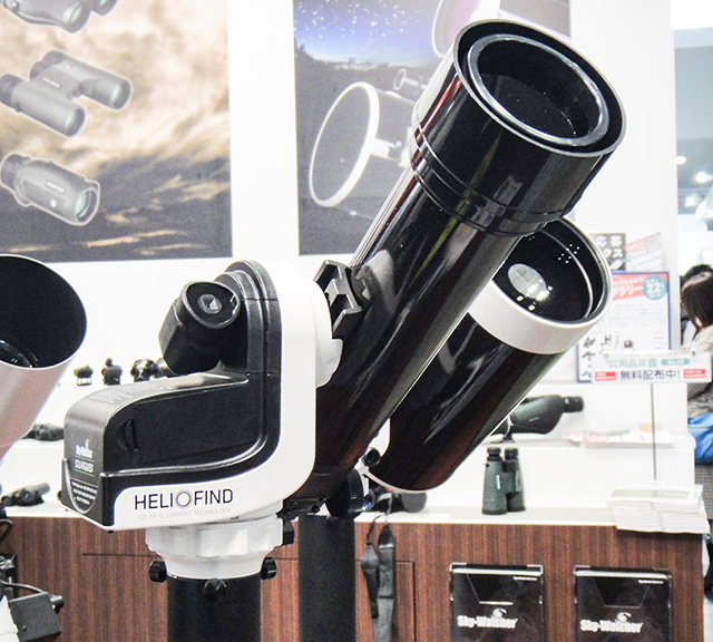 サイトロンジャパンのブースでは、シュミットカセグレンの主焦点位置に補正レンズを配してハイスピードアストロカメラにした「RASA」の口径20cm(8インチ)モデルと、口径34cm(14インチ)モデルが展示されていた。価格未定だが、20cmは「25万円前後」とかなり求めやすい価格になるという。参考出品のSky-Watcher Solar Quest(スカイウォッチャーソーラークエスト)は、NDフィルター内蔵の屈折経緯台だが、電子的ファインダーを使って、自動で太陽を安全に視野内に導入できるようになっている。