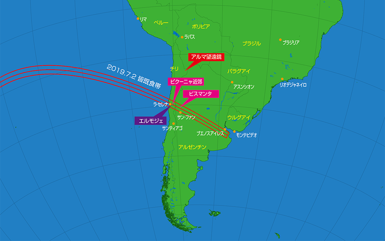 2019年7月2日の皆既食帯のほとんどは南太平洋上を通ります。太平洋からチリ共和国中部のコキンボ州に上陸した皆既食帯は、アンデス山脈を越えアルゼンチン共和国の首都ブエノスアイレスの南部で日没を迎えます。チリやアルゼンチンでは夕方北西方向の低い空での皆既食となります。