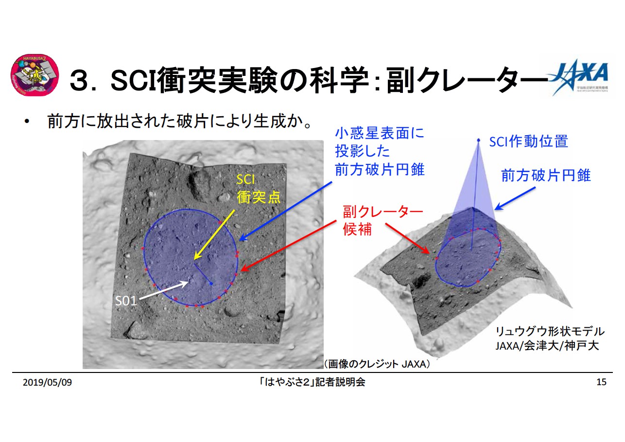 9日の記者説明会では、人工クレーターから約50m離れた場所にも、直径1mほどの「副クレーター」が円弧状に十数個並んで見つかったことが発表された。「はやぶさ2」プロジェクトサイエンティストの渡邊誠一郎さんによると、この副クレーターは衝突装置「SCI」から銅製の衝突体が打ち出される際に、銅板をSCI本体に固定していた部分が破片となって円錐状に飛び出し、リュウグウ表面に衝突してできたものと考えられるという。