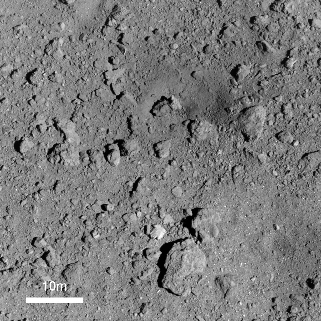 「はやぶさ2」が5月16日の低高度運用を自律中止して上昇する途中に光学航法カメラ「ONC-T」で偶然撮影された人工クレーター周辺地域。画像上寄りの黒っぽい領域が人工クレーター。撮影高度は約500m。約5cmのサイズまで解像されている。画像クリックで表示拡大