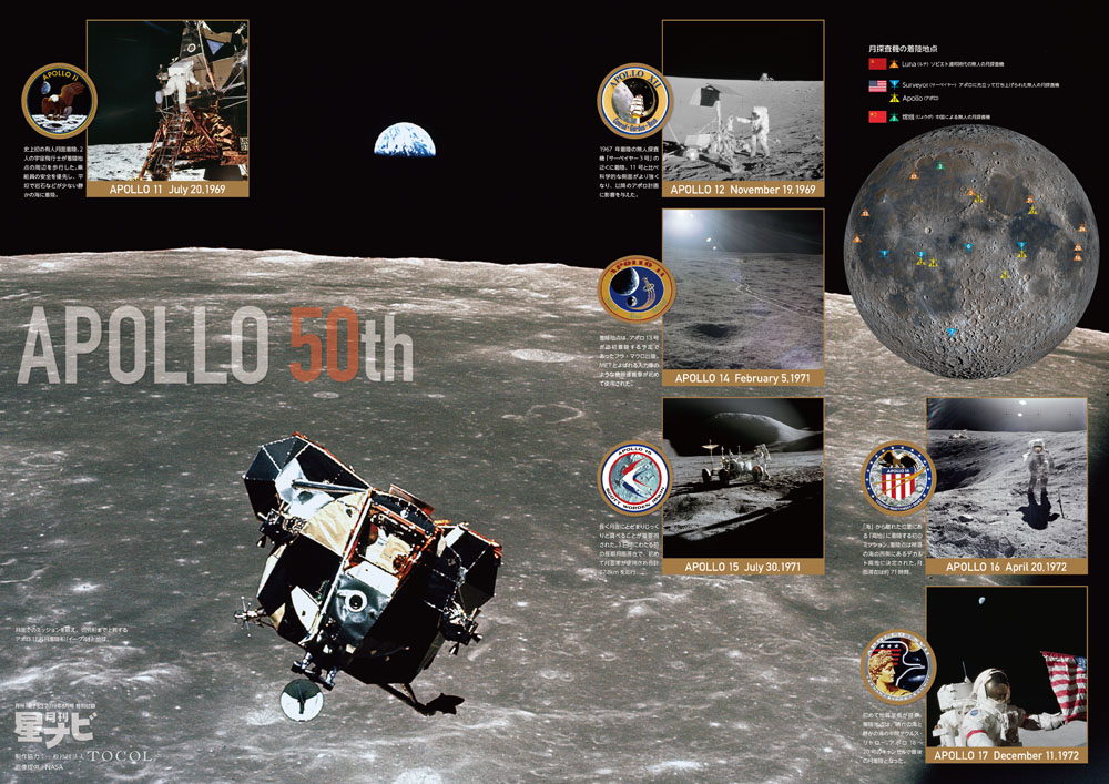 アポロ11号による人類初の月面着陸から50年となる7月21日(日本時間)が目前に迫ってきました。7月5日発売の「星ナビ」8月号には、当時の興奮がよみがえる大判ポスターが付いています。
