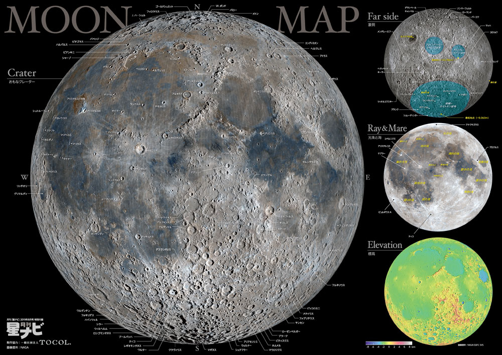 そして「月面マップ」面では、大きな月に主なクレーターや山脈などの名前と位置が描き込まれています。実際に望遠鏡で月面を観察したときに、見えている地形を調べるのに役立ちます。右側の3つの月は、上から「月の裏側」「光条と海」「高低差マップ」です。