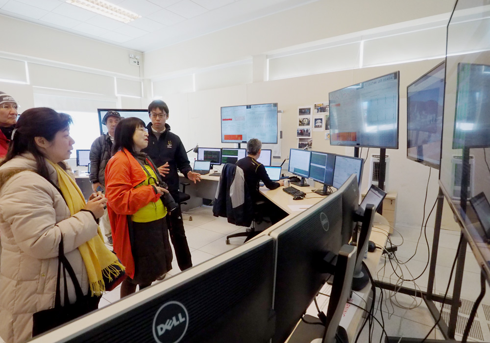 (1枚目)山麓施設にあるコントロールルームを見学。電波なので昼間でも観測をしています。解説をしていただいたのは、国立天文台チリ観測所の石井さん。原始惑星系円盤も、ブラックホールシャドウもここから観測されたと思うと、にわかにリアリティが増します。(2枚目)山頂施設に同行していただいたのは平松さんと宮田さん。山麓施設のデータ処理センターや機器のメンテナンス工房も案内していただきました。