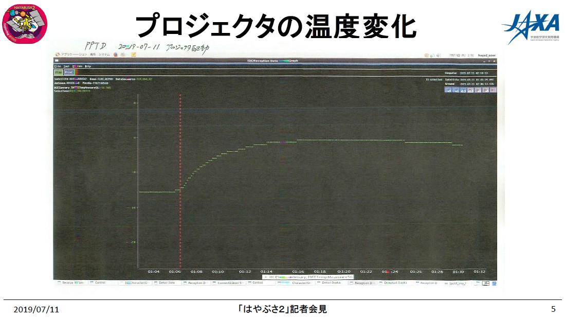 佐伯さんは「はやぶさ2」の弾丸を発射する火工品付近の温度データを示し、10時06分(機上時刻)ごろを境にして温度が約10度上昇していることから、この時刻に接地して確かに弾丸が発射されたとみられることを説明した。
