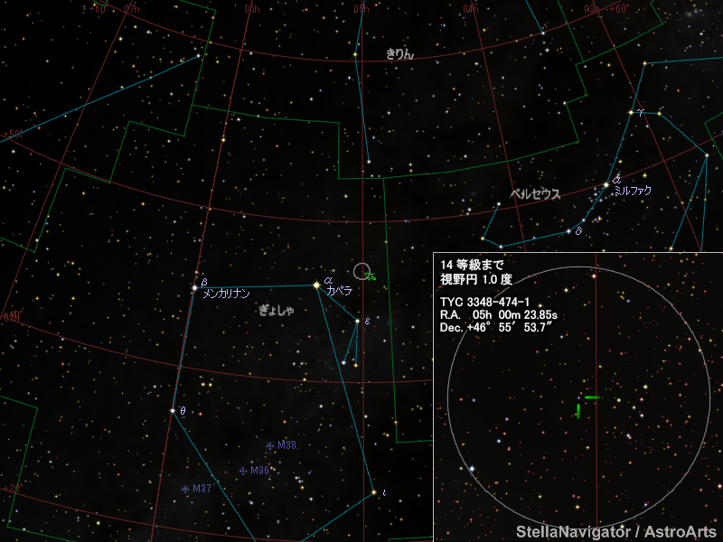 対象星はぎょしゃ座にあり、約12等級と暗いため、口径20cm以上の望遠鏡(できれば30cm級)を約20台並べてビデオ観測する必要があると考えられます。これだけの機材をそろえるためには、多くのアマチュア観測者の協力が必要です。