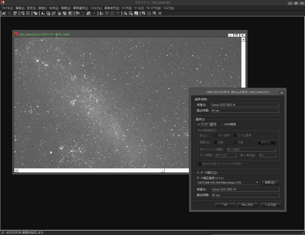 CR3形式のRAW画像をベイヤー配列で読み込んで、長時間露出で発生するダークノイズを除去。ベイヤー・RGB変換でカラー画像に変換。画像クリックで表示拡大