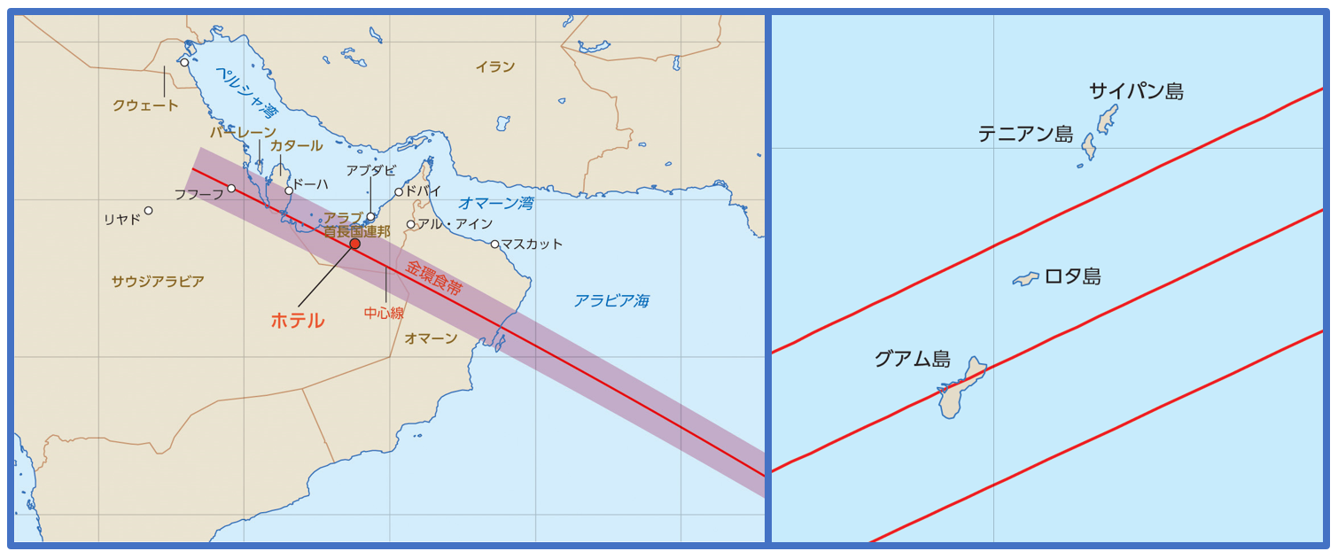 2019年12月26日のアラビア半島・南インド・シンガポール・グアム島金環日食の食帯。アストロアーツ/「星ナビ」協賛ツアーでは、アラブ首長国連邦(左)とグアム島(右)に観測地を用意している。画像クリックで表示拡大