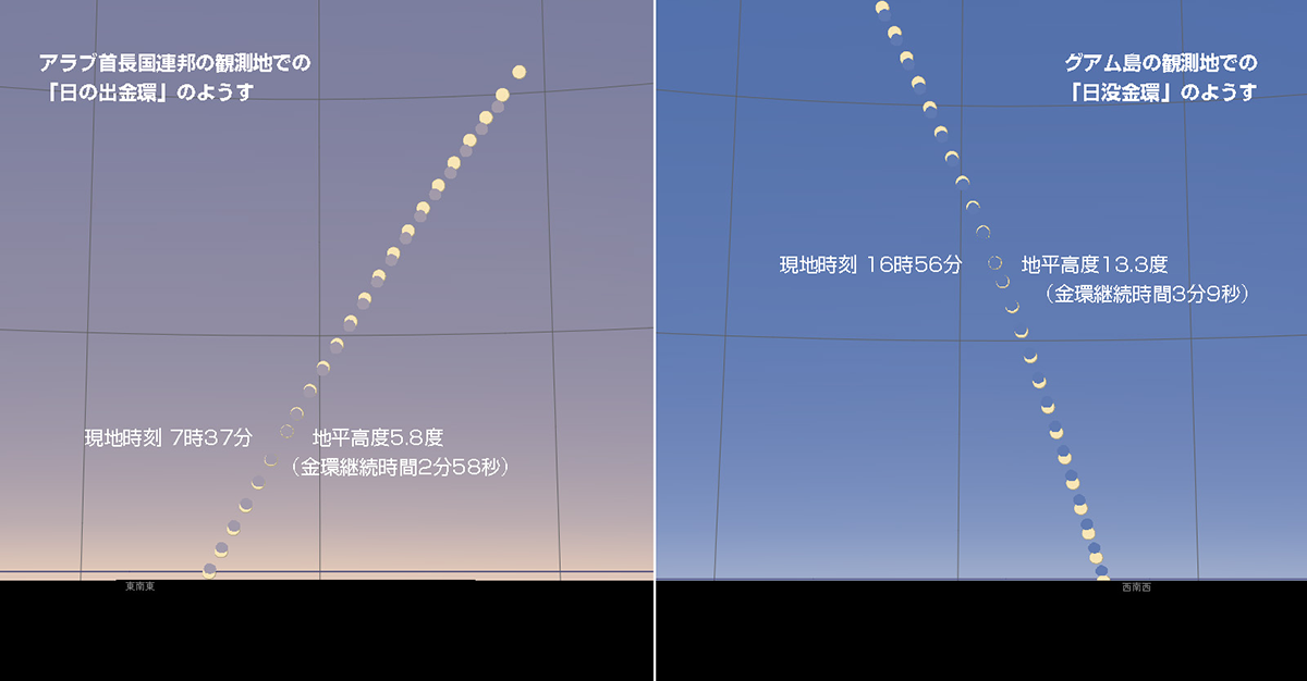アラブ首長国連邦の砂漠地帯では三日月形に欠けた太陽が昇ってきて、現地時刻の7時37分を中心に約3分間、黄金のリングを見ることができる。金環時の太陽高度は5.8度で「日の出金環」となる。一方、グアム島では、太陽が西の空に傾いた現地時刻16時56分を中心として約3分間の金環食を楽しめる。グアム島での金環時の太陽高度は13.3度の「日没金環」で、太平洋に太陽が沈むと同時に部分食が終わる。