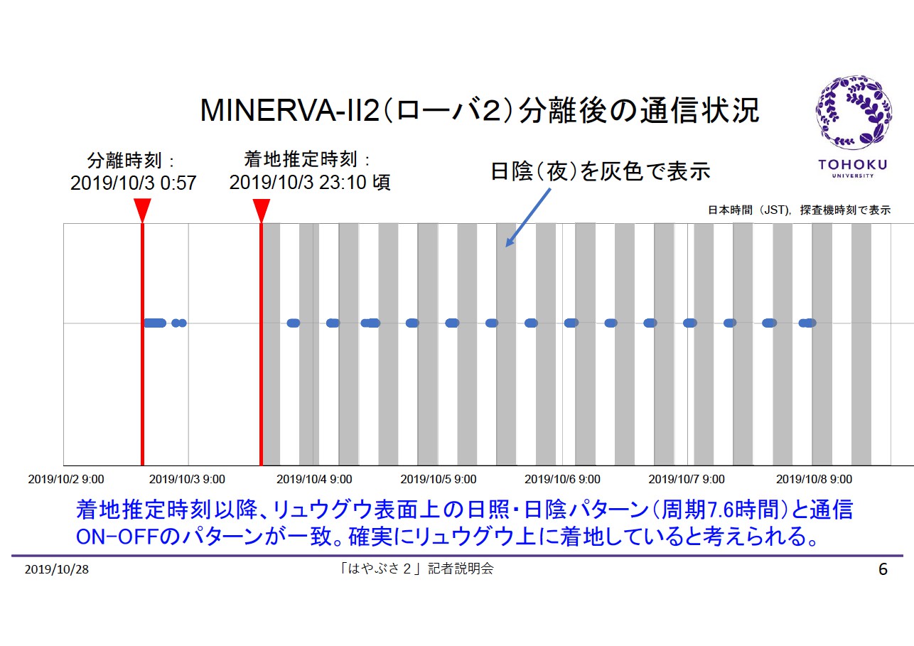 「MINERVA-II2」は機体の不具合によって、電源を使うホッピング移動機構や画像撮影などは行えない状況にあるが、「はやぶさ2」との通信は着地後も確立している。通信が確立する時間帯がリュウグウの自転周期(7.6時間)と一致していることから、リュウグウの表面にいることは確実で、着地地点が昼になると電源がオンになって「はやぶさ2」との通信がつながり、夜になると電源がオフになるという状況のようだ。