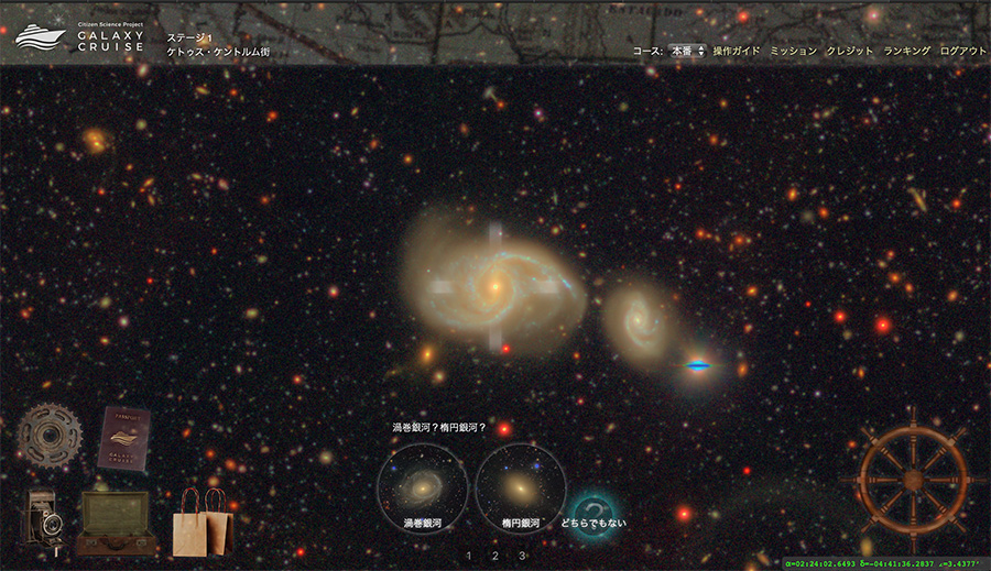 そこで、国立天文台では、研究者と一般市民が一緒に科学的活動を行う「市民天文学」プロジェクトとして、すばる望遠鏡の観測データという「宇宙」の大海原を航海しながら銀河の謎に挑むサイト「GALAXY CRUISE」を作成・公開した。市民がインターネットを利用して天文学のデータにアクセスし研究に協力する「シチズンサイエンス(citizen science)」は、海外では多く進められているが、日本ではGALAXY CRUISEが第一号だ。