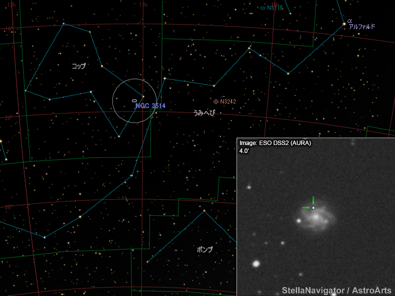 NGC 3514周辺の星図と、DSS画像に表示した超新星。画像クリックで星図拡大(「ステラナビゲータ」で星図作成。DSS画像の版権について)
