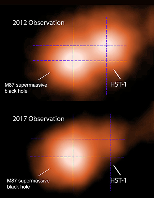 米・ハーバード・スミソニアン天体物理センターのBradford Sniosさんたちの研究チームはNASAのX線天文衛星チャンドラで、このジェットを繰り返し観測した。その結果、2012年と2017年の観測データから、ジェット中の一部分がブラックホールから遠ざかるように移動している様子がとらえられた。