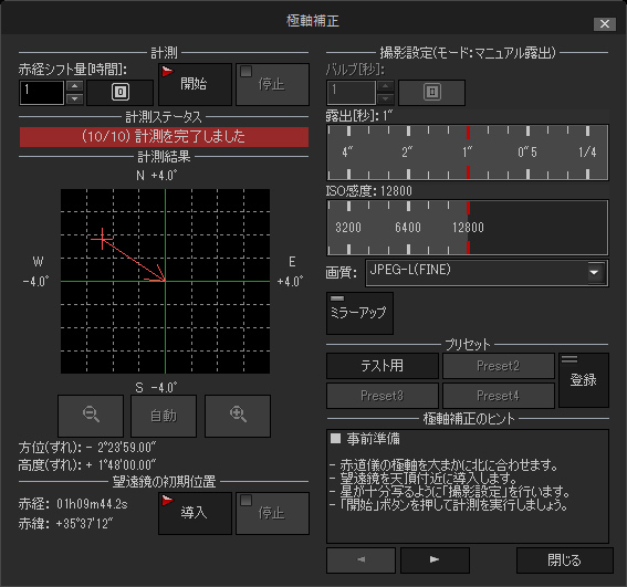 北極星を使わない極軸補正機能を開発。夜空を撮影して極軸のずれを検出し、その後明るい星を導入して、画面でその星を中央になるように極軸を調整して合わせます。