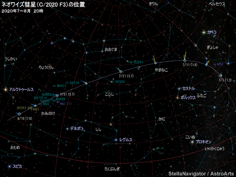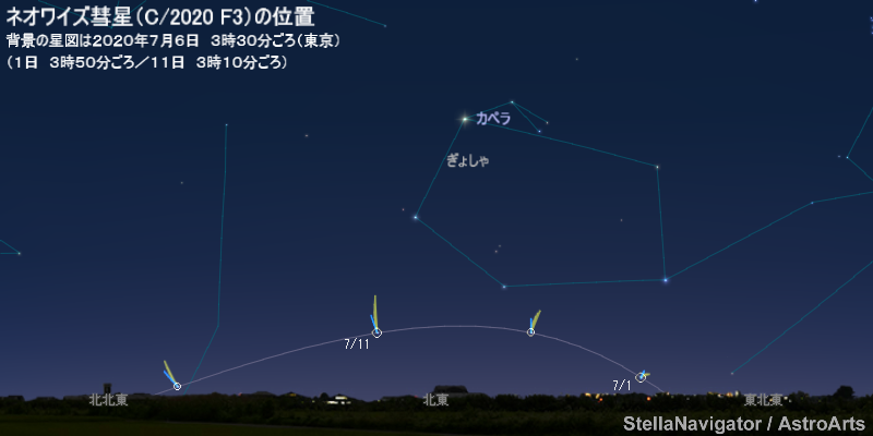 7月ごろ、ネオワイズ彗星(C/2020 F3)が明るくなると予想されている。ぎょしゃ座からやまねこ座、おおぐま座、かみのけ座へと移動していき、中旬までは明け方の北東の低空に、中旬以降は夕方から宵にかけて北西の空に見える。