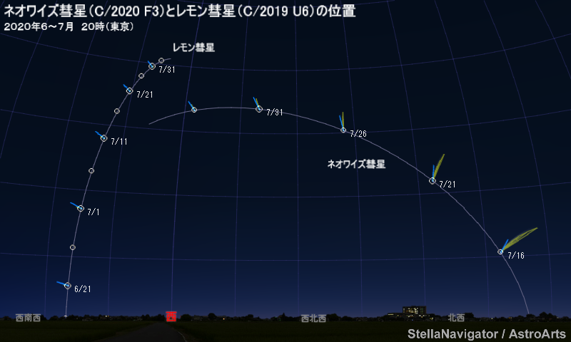 6月下旬~7月下旬のネオワイズ彗星とレモン彗星の位置(場所の設定は東京)。20時の方位と高さを表している。彗星は模式的に表現している。星図はステラナビゲータで作成。画像クリックで表示拡大