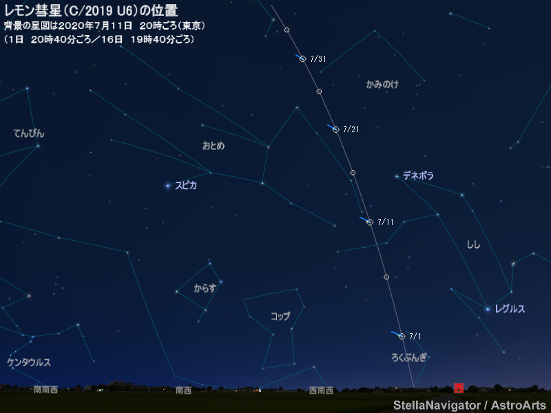 6月から7月ごろ、レモン彗星(C/2019 U6)が比較的明るくなると予想されている。ろくぶんぎ座からしし座、おとめ座へと移動し、夕方から宵の西の空に見える。