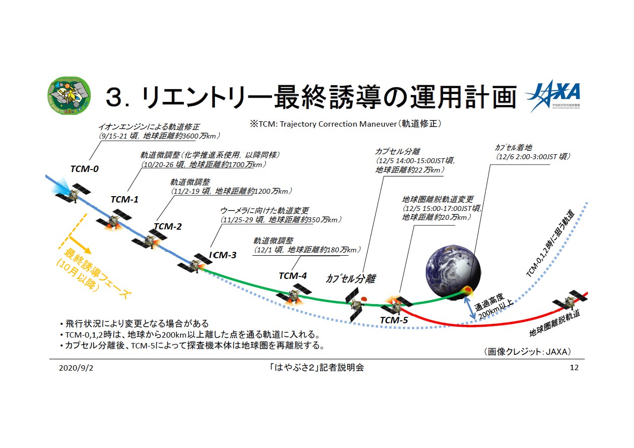 10月からは、リュウグウのサンプルを納めたカプセルをオーストラリアに着陸させるため、「はやぶさ2」を最終誘導する段階に入る。ここでは軌道修正は5回(TCM-1~TCM-5)予定されていて、いずれも化学エンジン(スラスター)の噴射で軌道変更が行われる。