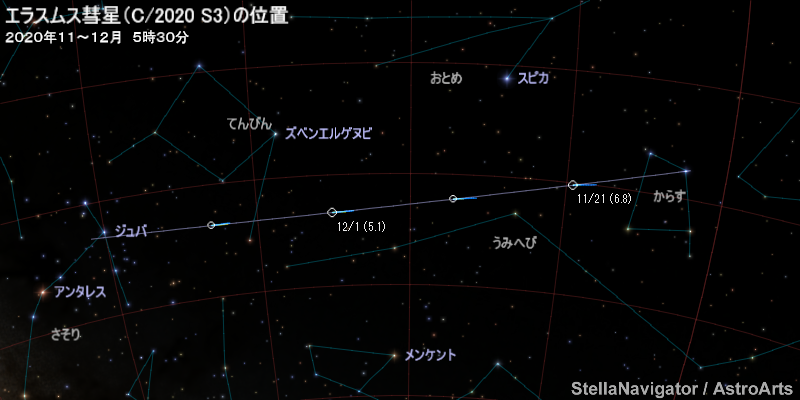 11月下旬から12月上旬、エラスムス彗星(C/2020 S3)が比較的明るくなると予想されている。おとめ座からてんびん座へと移動し、明け方の南東の低空に見える。