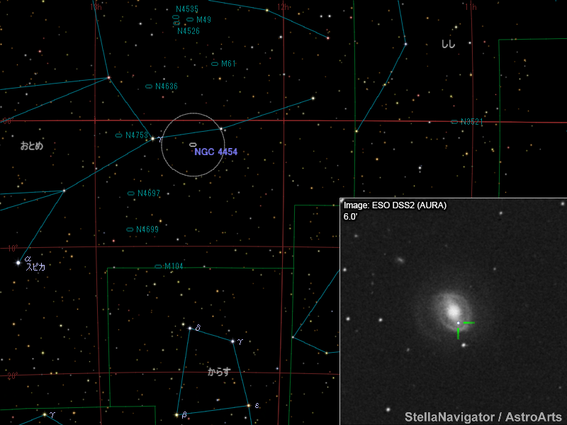 NGC 4454周辺の星図と、DSS画像に表示した超新星。画像クリックで星図拡大(「ステラナビゲータ」で星図作成。DSS画像の版権について)