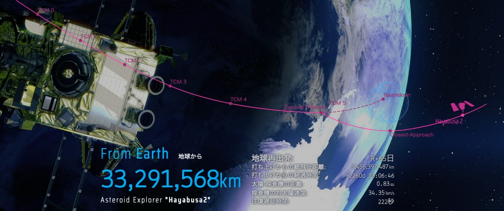 「はやぶさ2」プロジェクトwebサイトに表示されている2月10日現在の探査機の位置。地球から約3300万km離れている。画像クリックで表示拡大