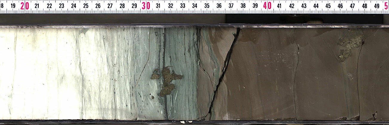 2016年にチチュルブ・クレーター内部を掘削して採取されたコア試料。左から右に向かって深くなる。中央の灰色がかった緑色の石灰岩層と濃い茶色の粘土層の境目にイリジウムが高い濃度で含まれていた。画像クリックで表示拡大(提供:Onshore science party of IODP-ICDP Expedition 364)