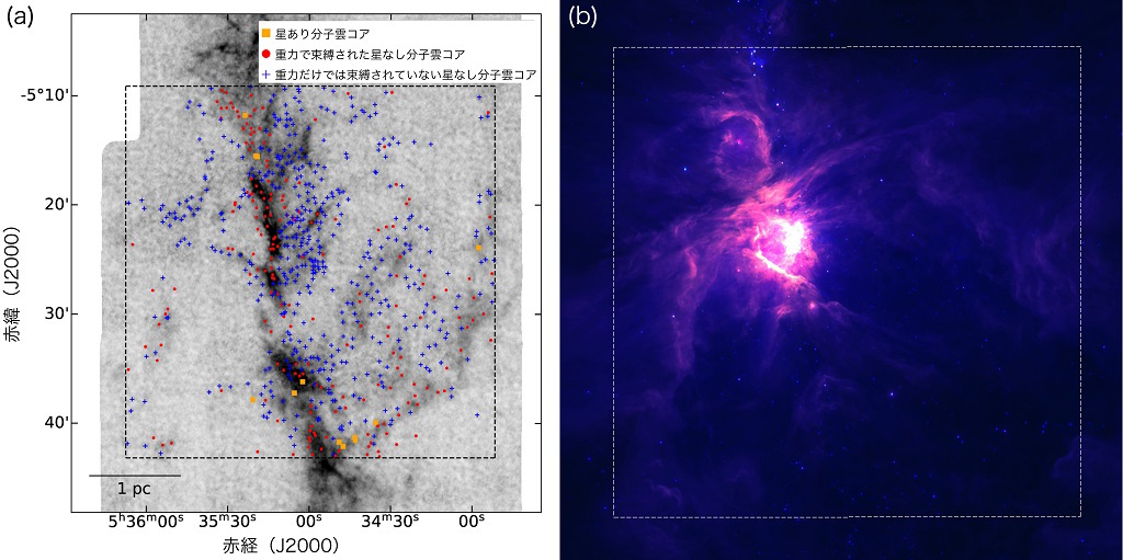 星の卵である分子雲コアについても、質量と個数の関係、つまり質量関数を考えることができる。これまでの観測から、分子雲コアにも「重いコアほど数が少ない」という関係があり、その個数の減り具合(=質量関数の傾き)は星のIMFとほぼ同じだが、個数のピークは分子雲コアの方が原始星よりも重い側にある(=原始星の方が元の分子雲コアよりも軽くなる傾向がある)、とされていた。しかし、同じ星形成領域で星と分子雲コアの質量関数を両方調べた例は過去に1、2例しかなく、この結果が星の誕生時に共通の性質なのかどうかはわかっていなかった。