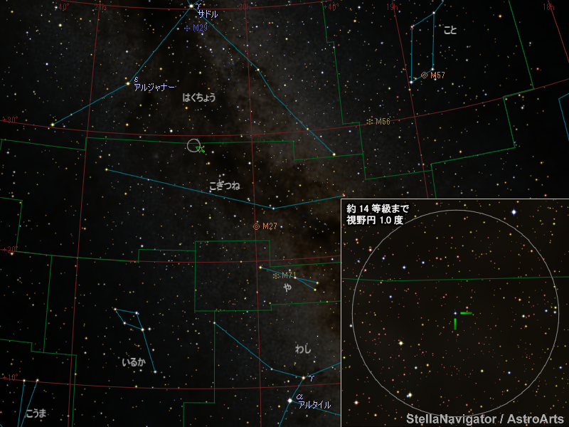 こぎつね座の新星の位置。画像クリックで星図拡大(「ステラナビゲータ」で星図作成)