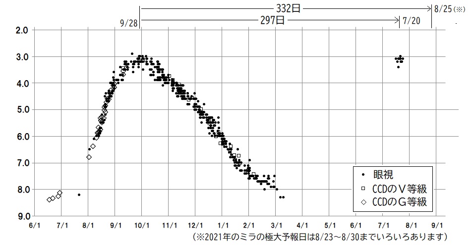 2021年のミラの極大時期は、計算される方によって多少のばらつきはありますが、8月23日から30日の間との予報が出されていました。変光星観測者にとってはミラが極大を迎える1か月前くらいの時期が、急激に明るくなっていくスリリングな時期です。星によっては増光中に一時的な増光の停滞が見られることもあり、この時期の変光の様子はたいへん興味深いものです。ミラについてもこの増光期を観測したいと多くの人が思っていましたが、3月から6月までは太陽が近くにあるために観測が困難で、6月ごろからは梅雨の天候不順な季節となって、なかなか観測ができませんでした。