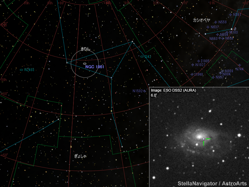 NGC 1961周辺の星図と、DSS画像に表示した超新星。画像クリックで星図拡大(「ステラナビゲータ」で星図作成。DSS画像の版権について)