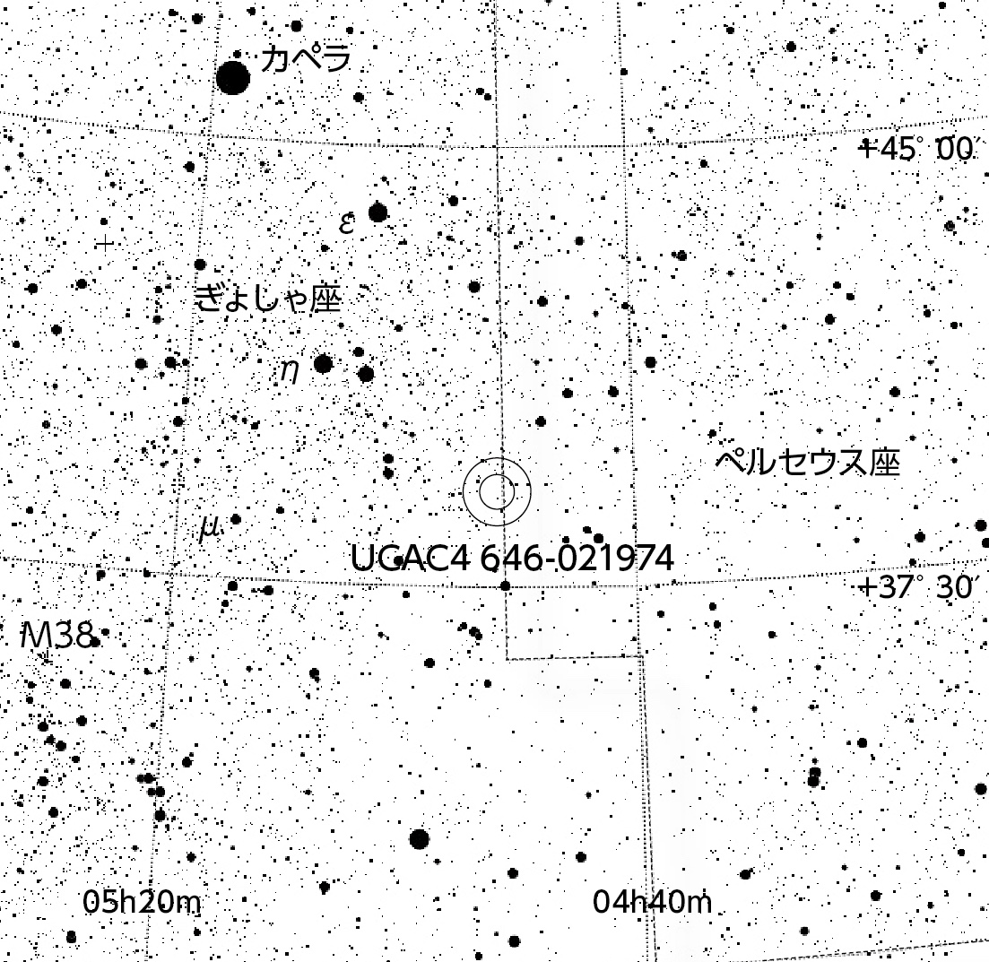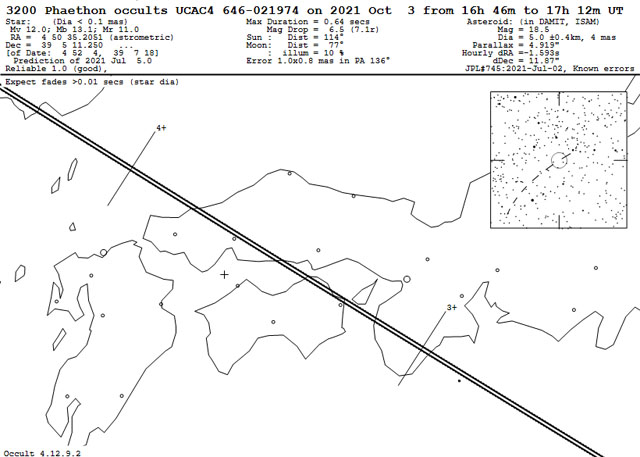 (1枚目)星食帯図。食の観測ができるのは、2本の線に挟まれた三重県~山口県北部にかけての狭い地域と予想されている。(2枚目)10月3日26:03(4日02:03)に起こる恒星食。ペルセウス座とぎょしゃ座の境界付近に位置する12.0等のUCAC4 646-021974(=GSC 2894-00131)がファエトンに隠される。それぞれ画像クリックで表示拡大